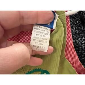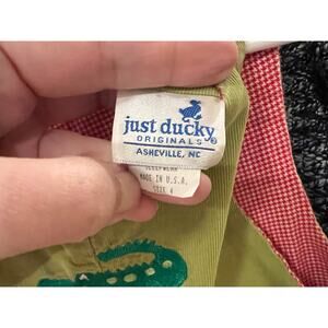 Adorable Just Ducky Originals boys’ Christmas longall, size 4T, made in the USA. Features a soft green corduroy exterior with red gingham lining, red button shoulders, and snap closures along the legs. The chest has a playful embroidered alligator wrapped in Christmas lights — a signature Southern holiday style!