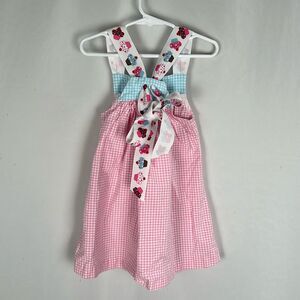 Pink and blue gingham dress. White ribbon with pink and blue cupcake design straps that tie behind back. There is a small spot on the ribbon (picture 4). Material not listed but the dress feels like cotton. Size 2. Non smoking home.