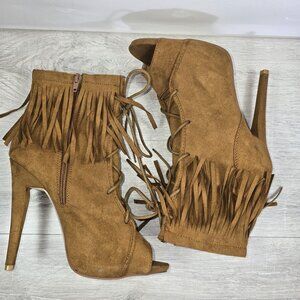Just Fab Faux Suede Peep Toe Lace Up Ankle Boots Sz 8.5 M Fringe Stiletto Heels