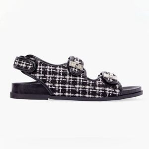 Cute sandals in a black and white boucle fabric with scattered silver threads for a touch of sparkle. Features JF Form Foam - Twice the thickness of a standard foam insole, with optimal rebound so the sole never flattens and you always feel supported.