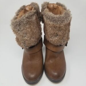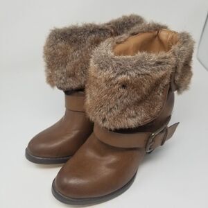 Faux leather boots with fur on outside. Brown. Size 6. Near new condition. Two side buckles. Heel is approximately 3". Just Fab " McKinley" style.