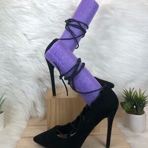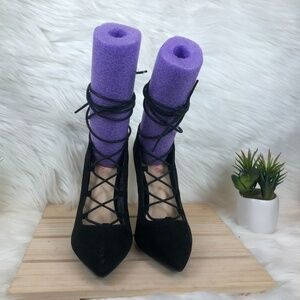 Just Fab Orana Black Lace Up Pumps. These pumps are anything but ordinary. They feature a faux suede construction and lace-up vamp and ankle detail. Pre-owned condition, normal wear.