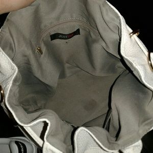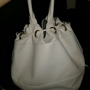 All white with gold tassel . Pull string one small stain inside most likely from lotion.