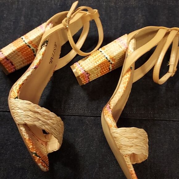 Just Fab beige sandals peach blue woven straw strappy sandals size 7