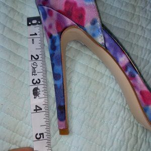 Floral print, vibrant purples, blues and pinks. Worn once. Side/ankle straps and back zip-up for easy wear. Some aging on ankle straps.
