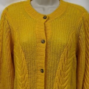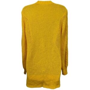 This sweater is in gently used condition. It is an open cable knit style, with a full button down. It is an oversized fit. The body is longer. Minimal pilling and fuzzing. Missing main tag, was cut off. Please see photos for details.
