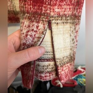Unlined mock neck wool blend top with hidden zippers at both sleeve hems, packs a detail ladden punch. Perfect cool weather top with a classic pattern and interesting details and cut. No flaws.