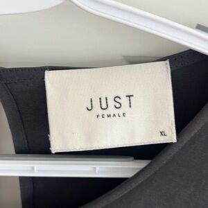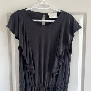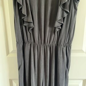 Sleevless jumpsuit from Just Female in a washed Black. Round neckline. Back button closure with deep slit. Cascading ruffles down front and back chest. Elastic waist. Front slash pockets. Relaxed straight leg. Unlined.