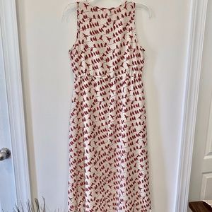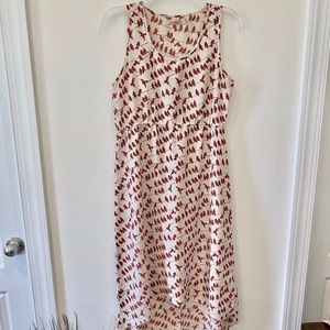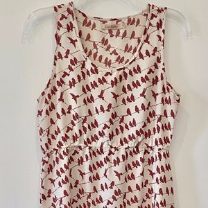 Beautiful red bird print on cream background. High in back, low in front. Pullover style with elastic in the waist. Gentle preowned condition. Stated size small. Measures 11" across the shoulders, 16" across underarms, 13" across waist plus 3" stretch, 38" long in front and 49" long in back.. Wear as is or with a leather belt and cardigan and boots! Excellent condition.