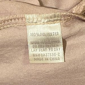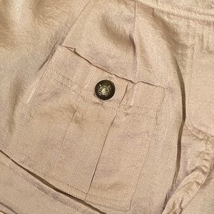 Satin pleated safari shorts by Just Ginger. Khaki with buttoned faux cuffs. Light weight and silky soft. Hidden on-seam, side pockets. 1 pleated front patch pocket and 2 pleated back patch pockets. Brass colored buttons with royal crests. Front center zip and hidden inside button closure with off-center double buttons on exterior. Unlined. Excellent condition.