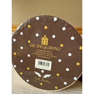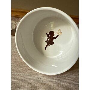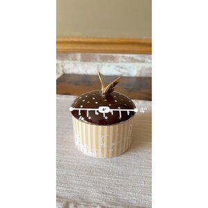 A delightful ceramic container that adds a touch of playful elegance to any kitchen or decor space, featuring a chocolate brown lid sprinkled with golden and white dots and topped with a quirky metallic butterfly handle.
