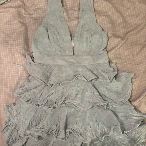 Chic dress with ruffle layers. Light blue hue. Perfect for elegant outings.