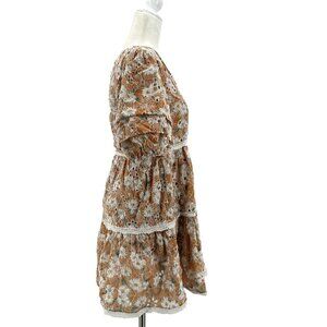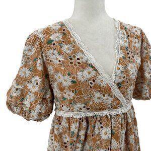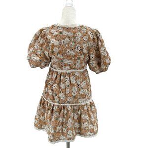 Just Me Daisy Embroidered Eyelet Puff Sleeve Tan Mini Dress Womens Small