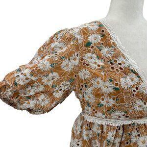 Just Me Daisy Embroidered Eyelet Puff Sleeve Tan Mini Dress Women's Size Small - Short V-neck A-line smock mini dress - shade of tan with a white yellow green daisy flower pattern & decorative embroidered stitching. Hints of white crochet lace around the dress. Short puff sleeves with elastic on the ends of the sleeves. Zipper closure on the side. Inner solid tan lining. Hippie, boho, bohemian, wedding guest attire, going out, date night 100% Cotton with 100% Rayon Lining.