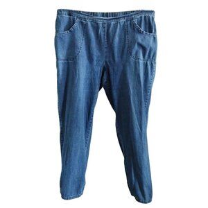 denim capris,  plus size fashion,  elastic waist pants,  summer outfit pants,  stretchy capris,  super dark wash,  lightweight denim,  machine washable,  versatile capris,  women's 2X denim,  relaxed fit clothing,  women's casual bottoms,  travel-friendly pants,  stylish errands outfit