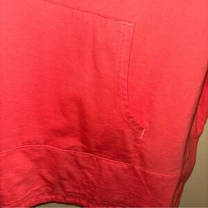 Vibrant coral hoodie with short sleeves. Features drawstrings and a front pocket.