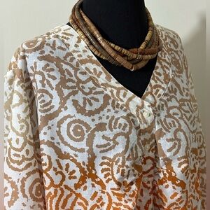 An adorable tunic in such a the perfect vacation stile. Cool as a breeze. So versatile Just slip on a pair of capris and go. You can also slip over a simple peach or tan dress. It has a 3/4 sleeve. A loose fitting elastic which is the way it came. At the bust line there are gathers in the front band for a nicer look. Pit to pit measurement flatfold is about 27”. The total length from the top of shoulders to hem also measures 27”. EUC Hardly worn. No visible flaws. Questions please ask