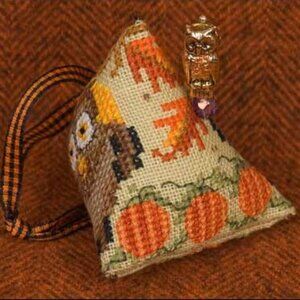 Just Nan Hootzi Humbug Pin Cushion Cross Stitch Kit. Includes what is shown here- fabric, thread, beads and ribbon. May require additional materials not included.