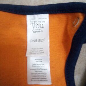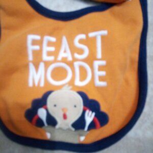 Baby Turkey Bib. Says: Feast Mode. Brand: Just One You Made By Carter's. Size: One Size. Color: orange/navy blue. Material: 100% Cotton. Made in China. Condition: Preowned, has no stains, no rips, no tears, no damage. Comes from a smoke free home. Thanks for watching!