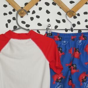 Size 2T, very good condition, Rash Guard: 83% polyester 17% elastane, Swim Trunks: 100% polyester