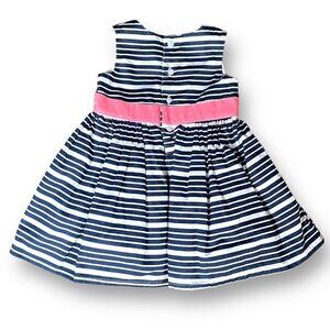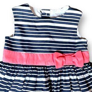 Navy blue and white stripe sleeveless dress with pink bow and band at the waist