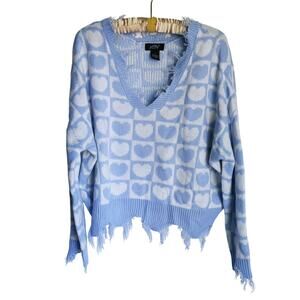 Just Polly Checker Heart Graphic Sweater Blue Deconstructed Fringe L Grunge Y2K