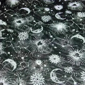 Reach for the stars with this celestial Just Polly mesh top — a dreamy mix of moonlit allure and modern edge. Its sheer black mesh is adorned with white suns, moons, and constellations, creating a statement piece that’s perfect for layering or nightlife glam.