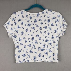 Just Polly Size M Crossover Crop Top White Ribbed Blue Toile Floral Coquette