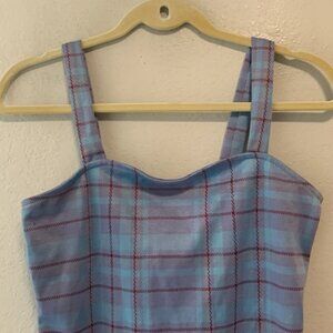 Burgundy, gold, light blue, and light purple plaid pattern fitted mini dress. It reminds me of dresses I would see in the 90s on movies like clueless or in a Delia’s catalog. Super cute for theme parties and dances or for costumes.