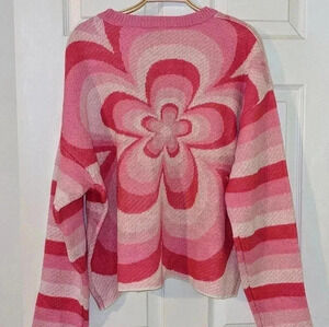 Groovy pink floral knit sweater, featuring a retro flower power design in shades of pink and white. This eye-catching piece boasts long sleeves and a comfortable crew neck, perfect for adding a pop of color and vintage flair to any outfit. The striped pattern on the sleeves complements the central floral motif. Ideal for casual outings, cozy days at home, or adding a fun, playful touch to your everyday style.