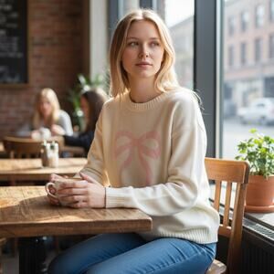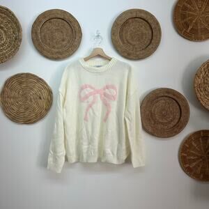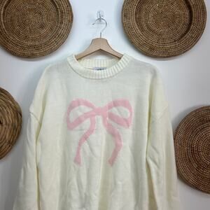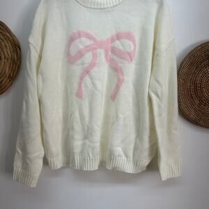 Just Polly White Pink Bow Graphic Crew Neck Knit Sweater Feminine Winter XL
