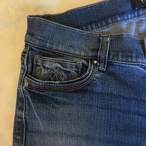Gently worn, faded denim with some embroidery on right front pocket and back two pockets, small rhinestones on sides of pockets; Comfortable fit with some spandex; Approximately 29.5 inch inseam; Easy care; Perfect with flats, heels and boots!