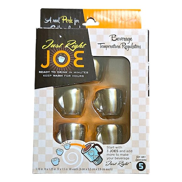 Keep your coffee at the perfect temperature with Just Right Joe Beverage Temperature Regulators. This set of five reusable capsules cools hot drinks to a drinkable temp in minutes and keeps them warm for hours. Ideal for coffee lovers on the go, each compact Joe fits easily into your mug or thermos. Start with three and add more to customize your comfort.