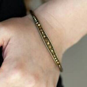 Gradually increasing in size at the center, two sections of topaz rhinestones are encrusted along a dainty copper bangle rippling with wavy textures for a timeless twist.