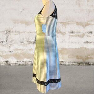 This Taylor dress showcases a sophisticated A-line silhouette in a striking black and white palette, perfect for a wedding guest or cocktail event. The sleeveless design features a crew neck with a delicate black lace overlay, adding a touch of elegance. Crafted from a structured fabric, the dress maintains its shape beautifully, while the horizontal stripes and black trim at the hem create a modern, geometric appeal.