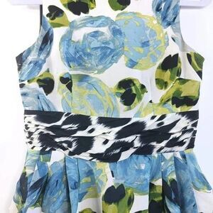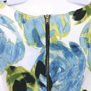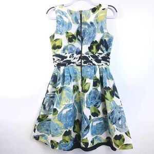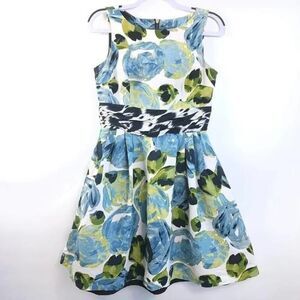 This Just Taylor dress features a silk blend fabric with a vibrant floral print in blue and green, embodying a classic fit and flare silhouette.