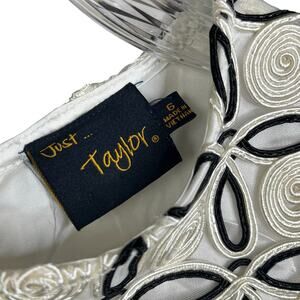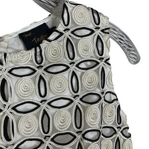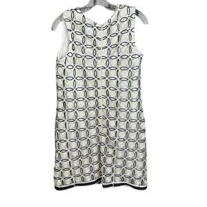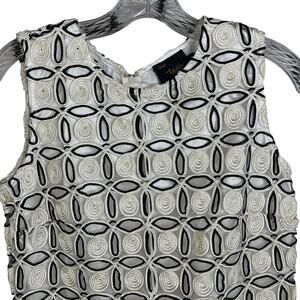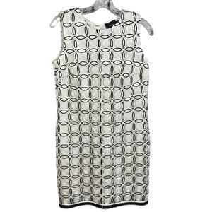Lined sleeveless white embroidered sheath dress. White and black knee length. Size 6. 100% polyester.