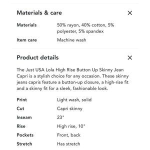 Just USA Denim Lola Button Up Skinny Jeans Size 14/32. Happy to answer any questions; thanks for shopping!