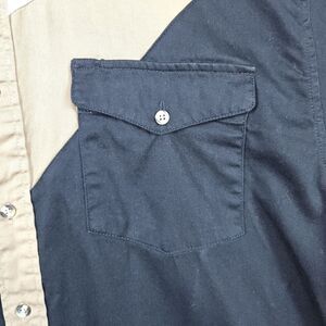 Very cool design on this Just Western shirt! The tag size is large. Made of 100% cotton. Some smudging around the fabric tag and some splotching near the bottom, both visible in the photos.