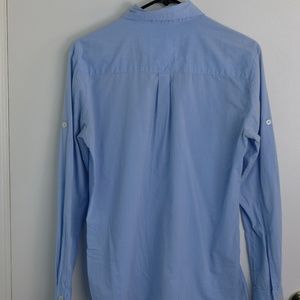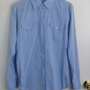 This ROCK'N shirt is a definite MUST have in everyone’s closet. It’s very light weight, double pocket front button down, spread collar and relaxed fit. super comfy, nice light blue color, great for spring and summer. Some signs of wear, not defects but looks like a small stain dot. Nothing super noticeable. But priced according to these markings.
