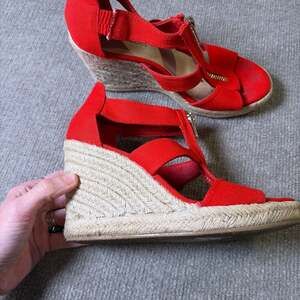 JustFab Karsey wedge heels in a vibrant red, featuring a unique gold front zipper detail for easy wear and a stylish touch. These sandals are a women's size 6.5 with a comfortable wedge heel, perfect for adding a pop of color to any outfit. The wedge is espadrille-style wrapped, giving them a summery, casual yet elevated look. They are in used condition, showing some wear on the soles consistent with use but are otherwise well-maintained. Ideal for a night out or a casual day event. Original box included.