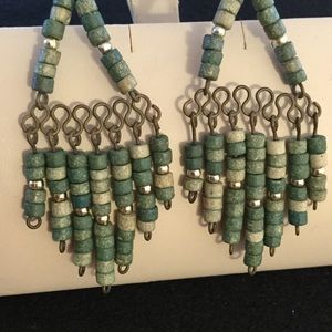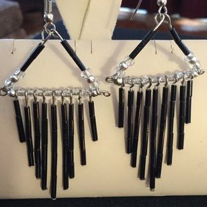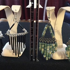 Two pair of Dangling earrings to add some "Boho Fun" to your wardrobe. Black Bugle beads hang "chevron" style; accented with clear glass beads off a triangle base. The second pair use small stone beads in shades of green; accented with silver spacer beads on bronzed wire. See close-up pics for measurements. EUC