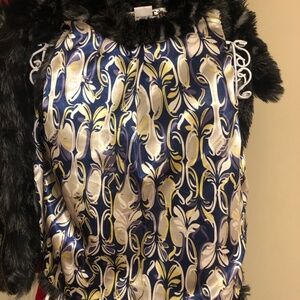 This beautiful black with touches of gray faux fur vest is sure to please. Vest is very warm and can be dressed up or down. Vest has a zip up design and full collar. Vest also has a beautiful satin lining I included pics. Vest measures 24 inches long and 42 in bust. Shoulder to Shoulder measures 17. This vest is really pretty I. Excellent condition. I Ship next day grab it while u can thank you 😊