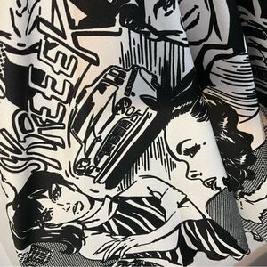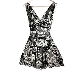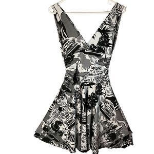 Omg- this dress is everything! Black and white Lichtenstein Skater dress by Just In Time USA. Size S/P. Crossed front chest, sleeveless, vneck ruched waist, flowy skirt, vback! Plenty os stretch for a smooth fit. Pop Art Cartoons and quotes all over! “Darling, it’s too late and I have to GO AWAY! Unbelievable. Like new! Flat lay 38” L, 15.5” P-P, 12 W. #popart #rockandroll #lichtenstein