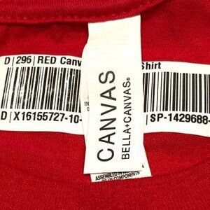 This is a NOS (New Old Stock), red, 2XL, 100% cotton adult T-shirt from Canvas and was manufactured in Nicaragua. We measured 22" across and 29" top to bottom.