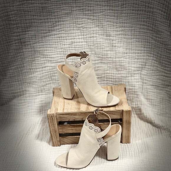 JustFab Beige Suede Laser-Cut Peep Toe Block Heel Sandals, Women's Size 8.5 — Elegant and versatile.
