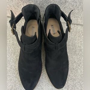 Step into style with JustFab's Black Ankle Booties, designed with a sleek suede finish and elastic side panels for effortless wear. These booties feature a minimalist design, perfect for pairing with any outfit. The contrasting light-colored sole adds a modern touch, making them a versatile choice for both casual and smart-casual occasions.