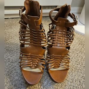 Elevate your style with these sophisticated JustFab heels, featuring a rich brown color and an intricate strappy design. The chunky 4-5 inch heel and substantial platform provide both height and stability, making them perfect for a night out.
