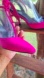 High heels with wrap around ankle strap. Fuchsia berry pink fabric finish. Size 6.5. Pre-owned with one small mark to the left shoe highlighted in photo could likely be cleaned off.