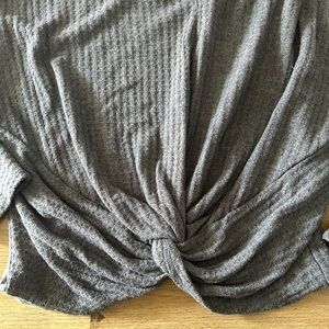 This stylish grey lightweight sweater features a trendy knotted front design, perfect for layering or wearing on its own. Made with a soft, waffle-knit fabric, it provides comfort and a relaxed fit. Suitable for sizes up to a small. Ideal for casual outings or cozy indoor wear.